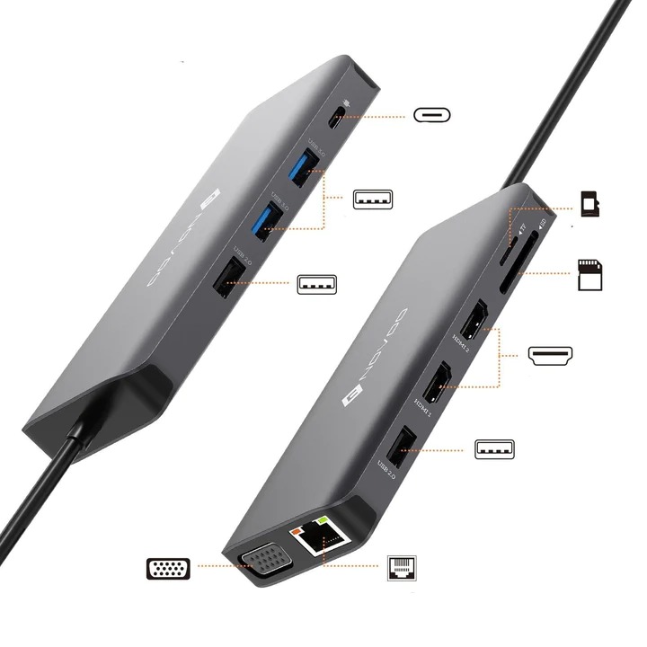 NOVOO Laptop Docking Station Meets Your Daily Needs: This USB C dock turns a single Type C into 11 ports: USB c to 2 HDMI 4K & VGA 1080P, USB3.0 *2, USB2.0 *2, Type C Power Delivery 100W charging port, SD & Micro SD card reader slot, 1000Mbps RJ45 Ethernet. NOVOO USB C dongle Expands your work opportunities and provides you more stable performance.