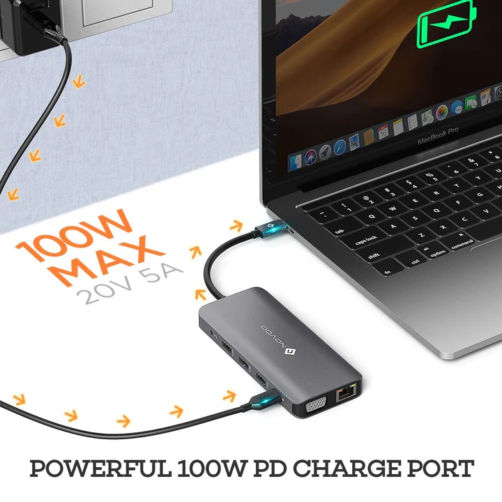 USB C to Ethernet & 100W PD Adapter: USB C dock 1000mbps Gigabit RJ45 Ethernet port is backward compatible with 100mbps/10mbps RJ45 LAN. 1 G movie can be downloaded in a few minutes. The PD charging port supports 100W/20V/5A. Our USB Type C Hub provides a high-speed charging experience that allows you to charge your Type C devices. IMPORTANT: The Type C port of the hub is only for charging, NOT for data transfer!