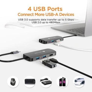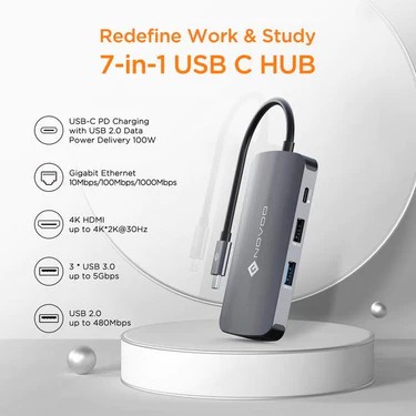 USB C Multiport Hub Meets Your Daily Needs: NOVOO USB C Dongle turns a single Type C on your laptop into 7 differents ports: USB C to HDMI 4K, USB 3.0 x 3, USB 2.0, Type C Power Delivery 100W charging port, 1000Mbps RJ45 Ethernet. Very suitable for office work, conference, home office, classroom, gaming or watching movies. Just plugin and go!