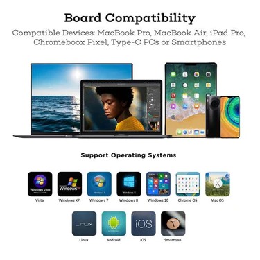 Compatible with almost any USB C device: Latest Macbook Pro 2020 / 2019 / 2018 / 2017 / 2016, New Macbook Air, Macbook 12', New iPad Pro or other USB C laptops, smartphones.