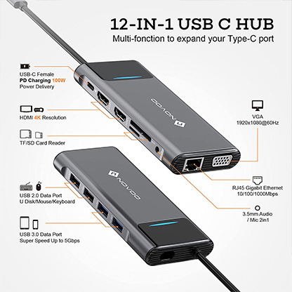 NOVOO Type C Hub expand triple monitors with our Adapter, HDMI port support up to 4K@30Hz; VGA port supports up to 1080@60Hz (Notice1: when VGA Port is connected, each monitor will be limited to a maximum resolution of 1080@60Hz. Notice2: For the MAC OS system, please note this USB c docking station only supports mirror mode and non-mirror mode. Non-mirror mode means that all the external monitors are the same content but are different from the host) Laptop Docking Station equipped with 2x USB 3.0 ports (up to 5Gbp/s) connect smartphones, tablets, hard drives for effortless data transfer on your host USB-C port. And the USB C dock provides 2USB 2.0, speed up to 480mb/s, it allows you to connect keyboard or mouse without any lags. 1000mbps Ethernet port brings you a 1G movie in few minutes. Equipped with the newest super-smart chip, up to100W USB C Hub shorten the charging time with power delivery 3.0 (backward with PD2.0) preventing overload, over-voltage, over-current, short circuit. You can use this docking station for MacBook Pro to power your laptop with your original 87W adapter. The portable USB C docking station has a storage hole to protect the USB C plug (male) of the docking station. When the LED light of the USB C hub is on and green, it indicates that the adapter is working.